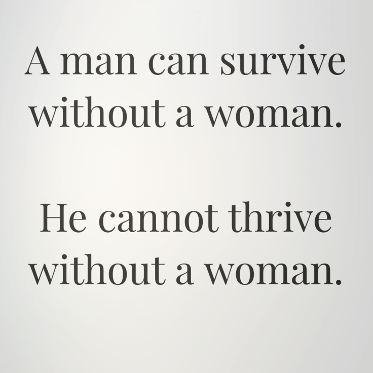 The phrase, “a man can survive without a woman. Yet he can thrive with a woman.” is true in many situations. I believe a man becomes better with a woman by his side. The bible also talks about, “Man should not be alone.” I think a man would just be surviving without a woman. His life will be complete with a woman. Now, some men choose to allow their mother to be the woman in their life, but still then she is needed to help the man thrive.
